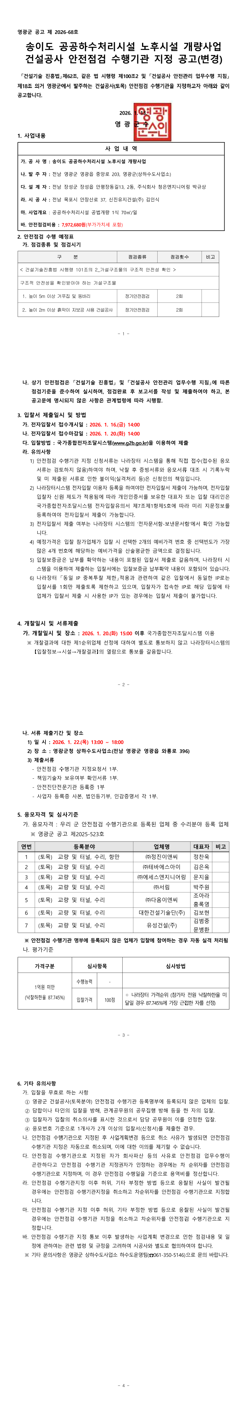 송이도 공공하수처리시설 노후시설 개량사업 안전점검 수행기관 지정 |