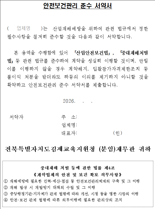 나. 본 입찰에 참가하고자 하는 자는 중대재해 예방을 위한 안전 및 보건 확보 의무 사항을 숙지하신 후 입찰에 응하여야 하며, 계약 체결 시에 【붙임 4】「안전보건관리 준수 서약서」를 제출하여야 합니다.