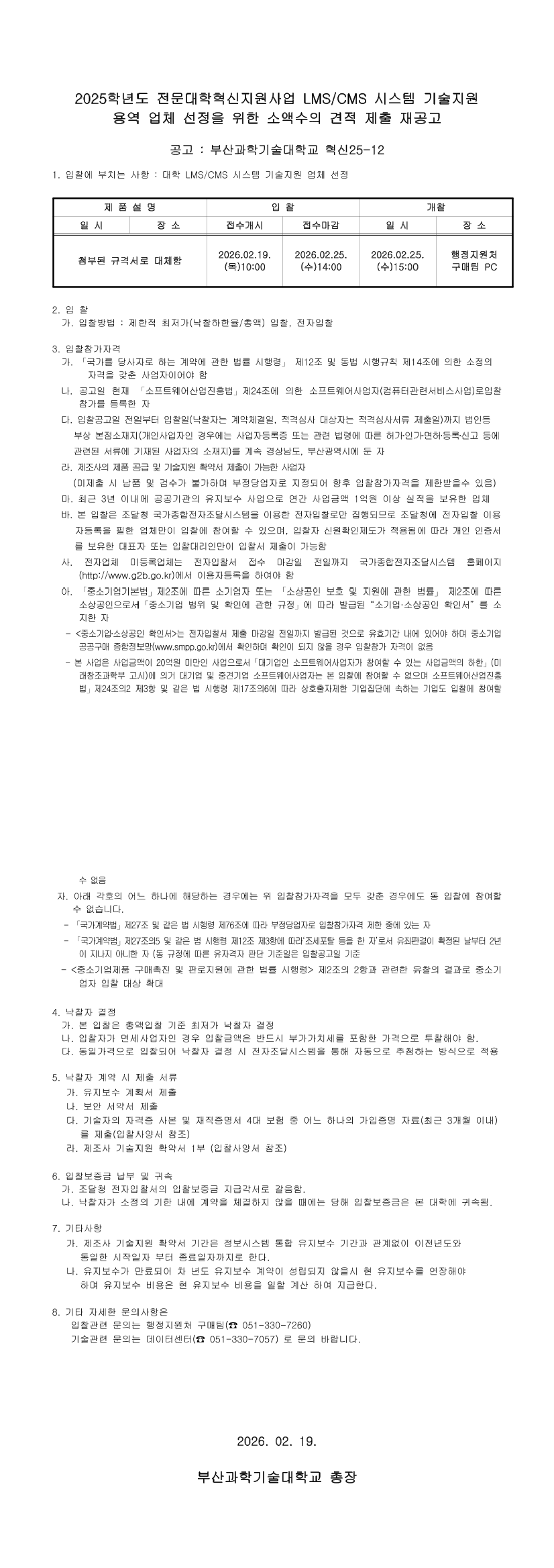2025학년도 전문대학혁신지원사업 부산과학기술대학교 LMS/CMS 시스템 기술지원 업체선정을 위한 소액수의 제출 재공고 |