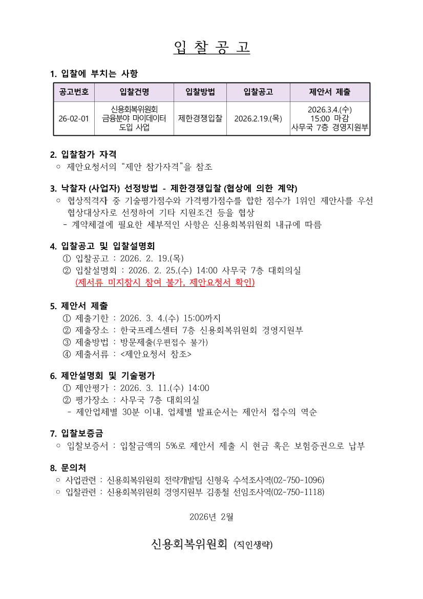 신용회복위원회 금융분야 마이데이터 도입 사업 입찰 공고 |