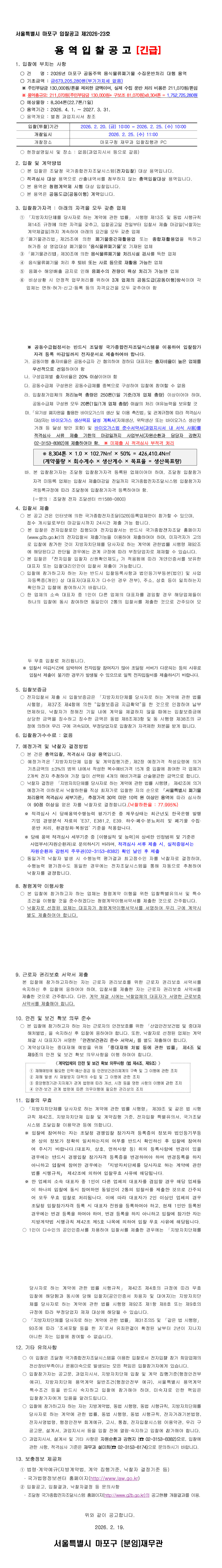 2026년 마포구 공동주택 음식물류폐기물 수집운반처리 대행용역 |