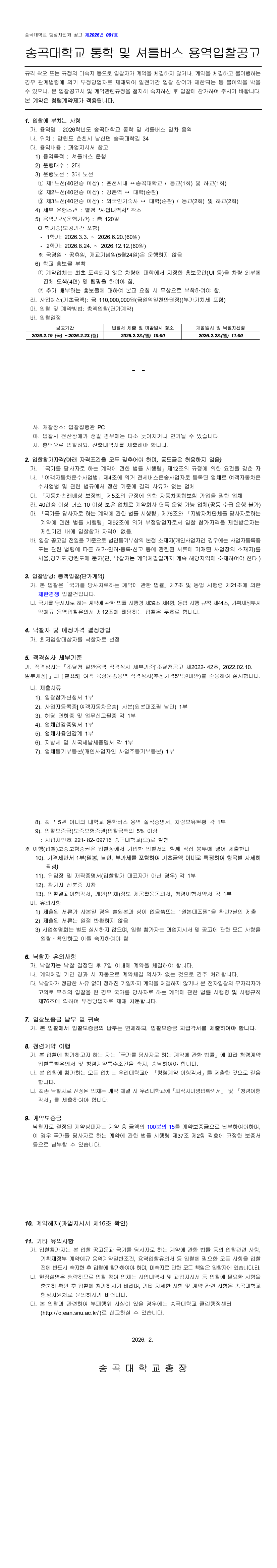 2026학년도 송곡대학교 통학 및 셔틀버스 용역입찰 |