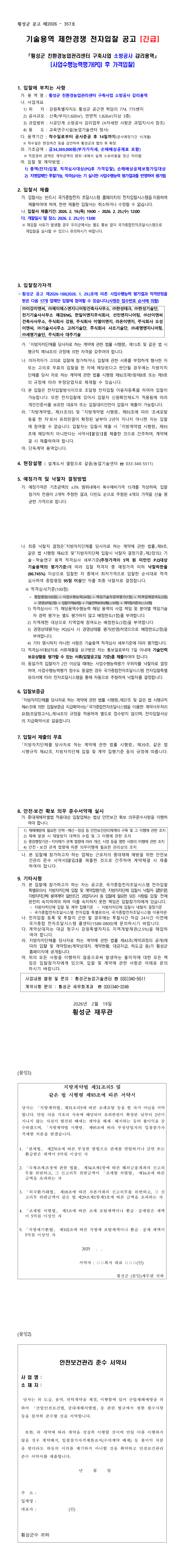 횡성군 친환경농업관리센터 구축사업 소방공사 감리용역 사업수행능력평가(PQ) 후 가격입찰 공고 |