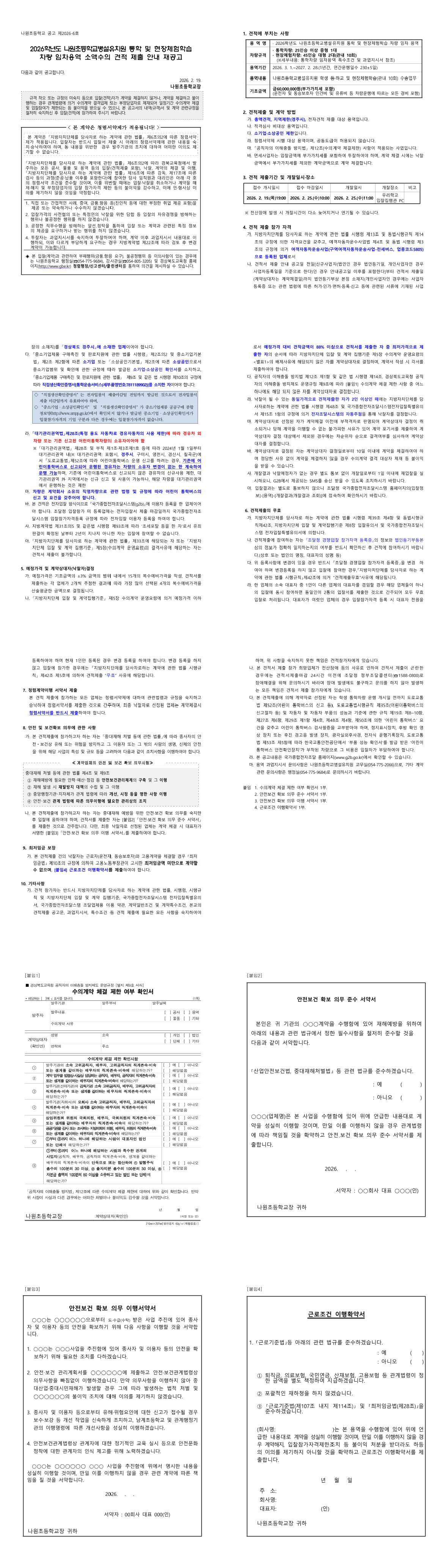 2026학년도 나원초등학교병설유치원 통학 및 현장체험학습 차량 임차 용역 소액수의 견적 제출 안내 재공고 |