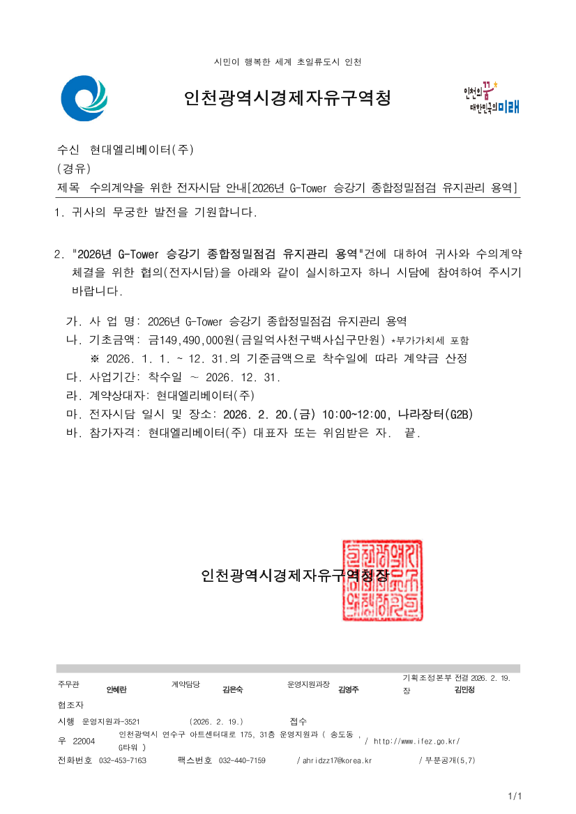 2026년 G-Tower 승강기 종합정밀점검 유지관리 용역 |