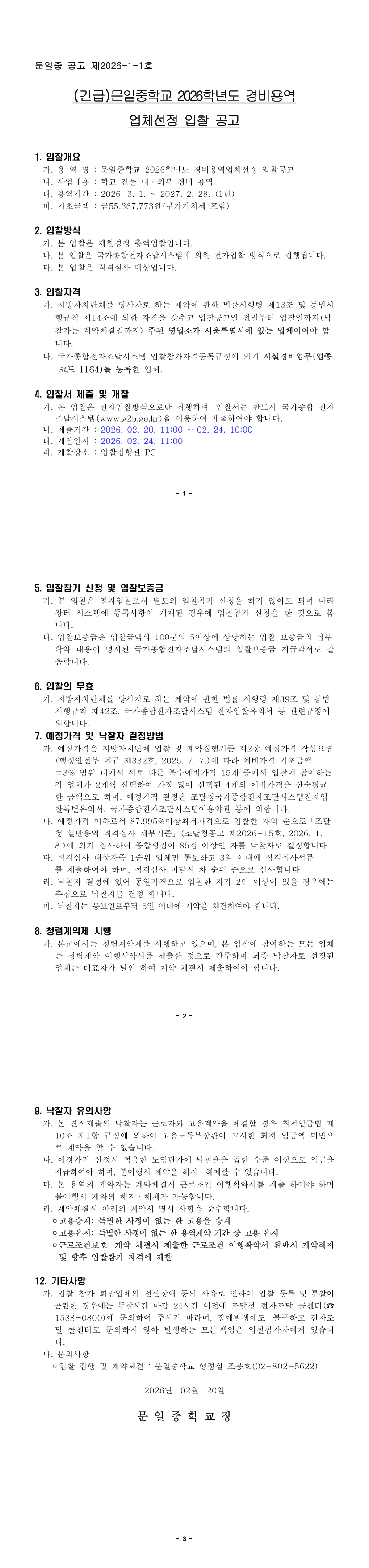 2026학년도 문일중 경비용역 입찰공고 |