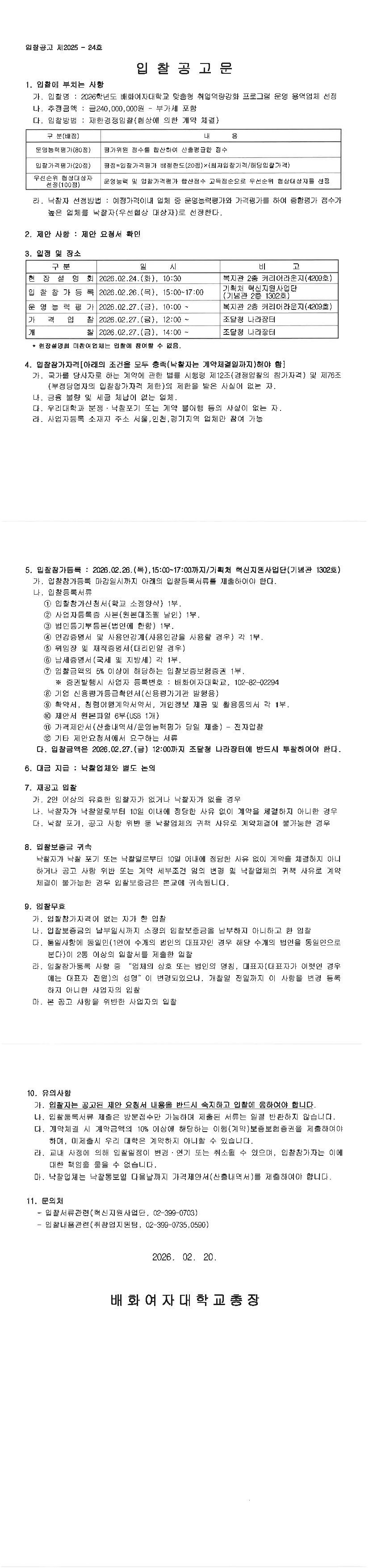 2026학년도 배화여자대학교 맞춤형 취업역량강화 프로그램 운영 용역업체 선정 |