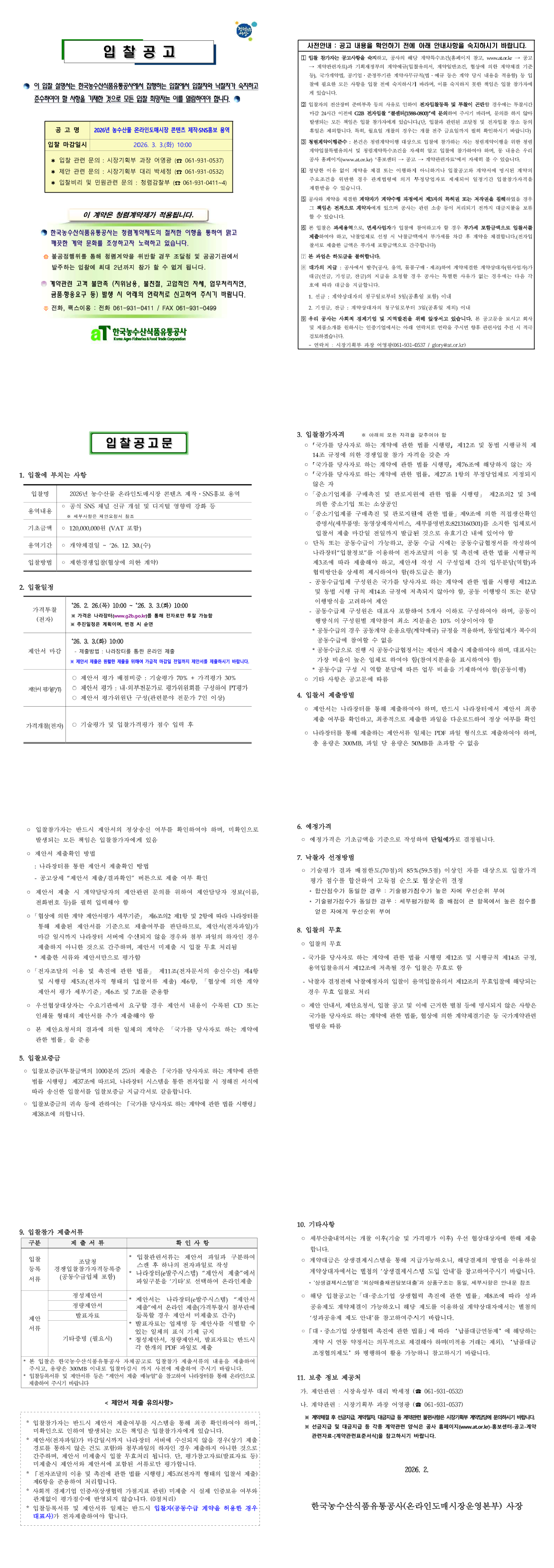 2026년 농수산물 온라인도매시장 콘텐츠 제작·SNS홍보 용역 |