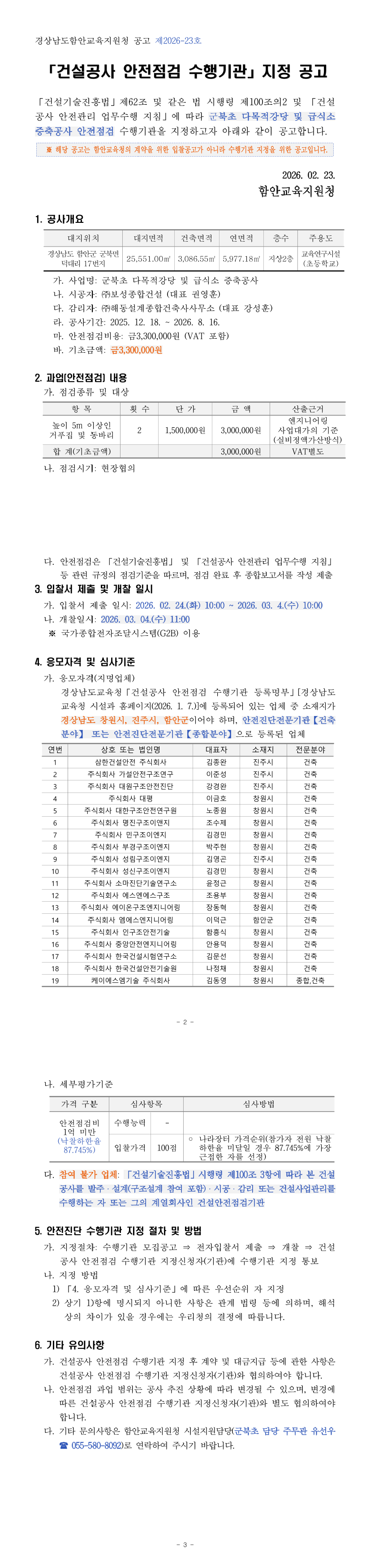 [지명입찰] 건설공사 안전점검 수행기관 지정 공고(군북초 다목적강당 및 급식소 증축공사 안전점검) |