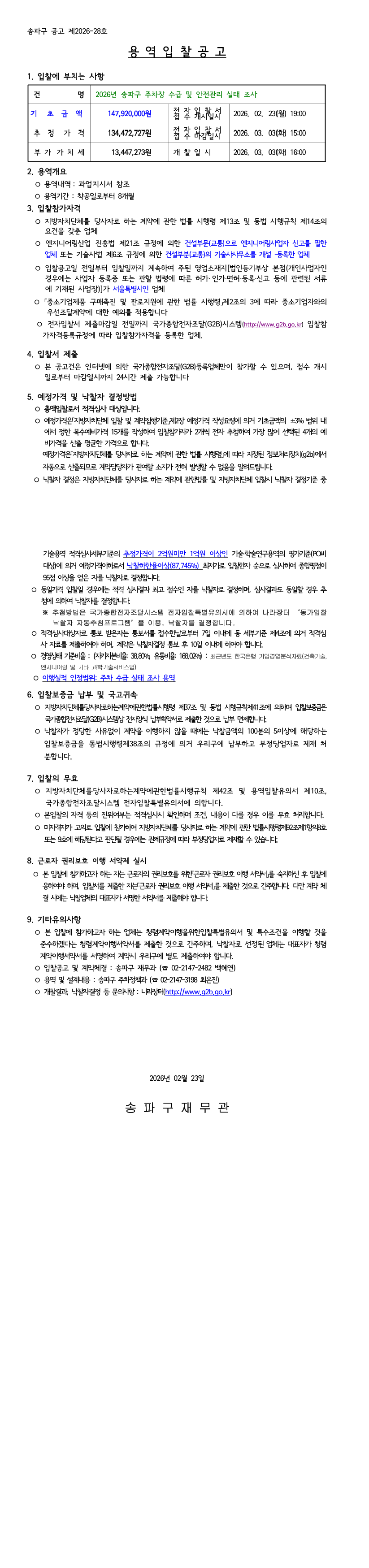 2026년 송파구 주차장 수급 및 안전관리 실태 조사 용역 |