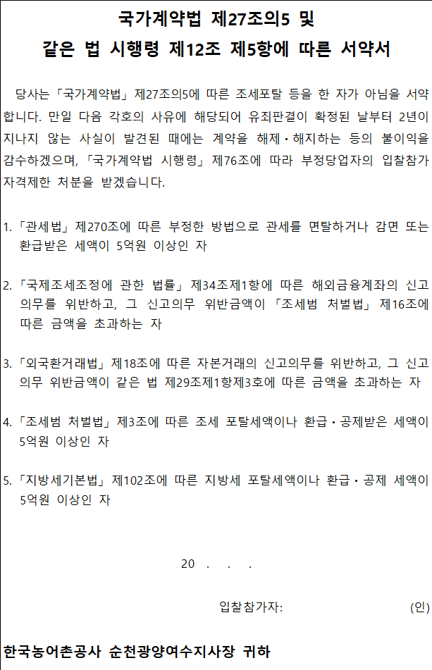 본인 또는 본인이 소속한 회사는 만일 각 중앙관서와 체결한 계약에서 「건설산업기본법」제34조제1항 또는 「하도급거래 공정화에 관한 법률」 제13조제1항이나 제3항을 위반하여 각 중앙관서에서 그 사실을 확인하여 귀 청에 통보한 일자의 1년 이내에 본 건 입찰공고일이 도래한 경우에는 「국가를 당사자로 하는 계약에 관한 법률」제27조의4 제1항 및 제2항에 의거 당해 입찰참가를 위하여 「국가를 당사자로 하는 계약에 관한 법률」 제15조제1항에 따른 대가 지급 시 하도급대금을 수요기관이 하수급인에게 직접 지급토록 할 것임을 확약합니다.