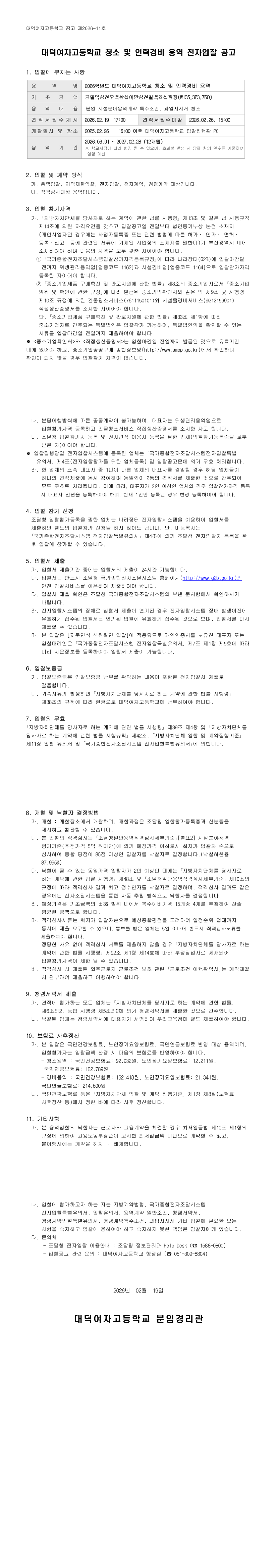 대덕여자고등학교 청소 및 인력경비 용역 전자입찰 공고 |