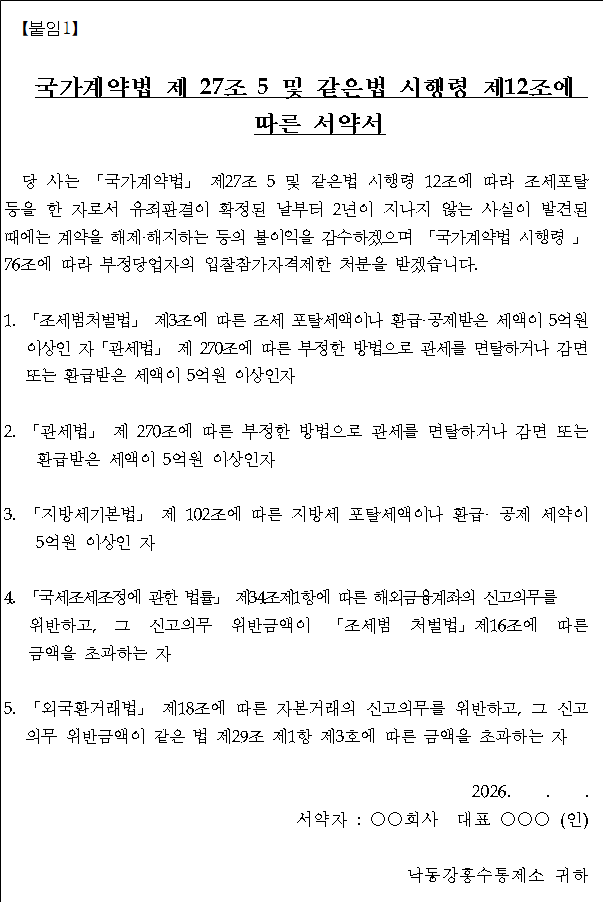 가. 본 입찰에 참가하는 모든 업체는 청렴계약 입찰특별유의서 제2조 제1항에 따라 청렴계약 이행서약서를 제출한 것으로 간주하며, 최종 낙찰자로 선정된 업체는 계약체결 시 【붙임3】의 청렴계약 이행각서를 제출하여야 합니다.