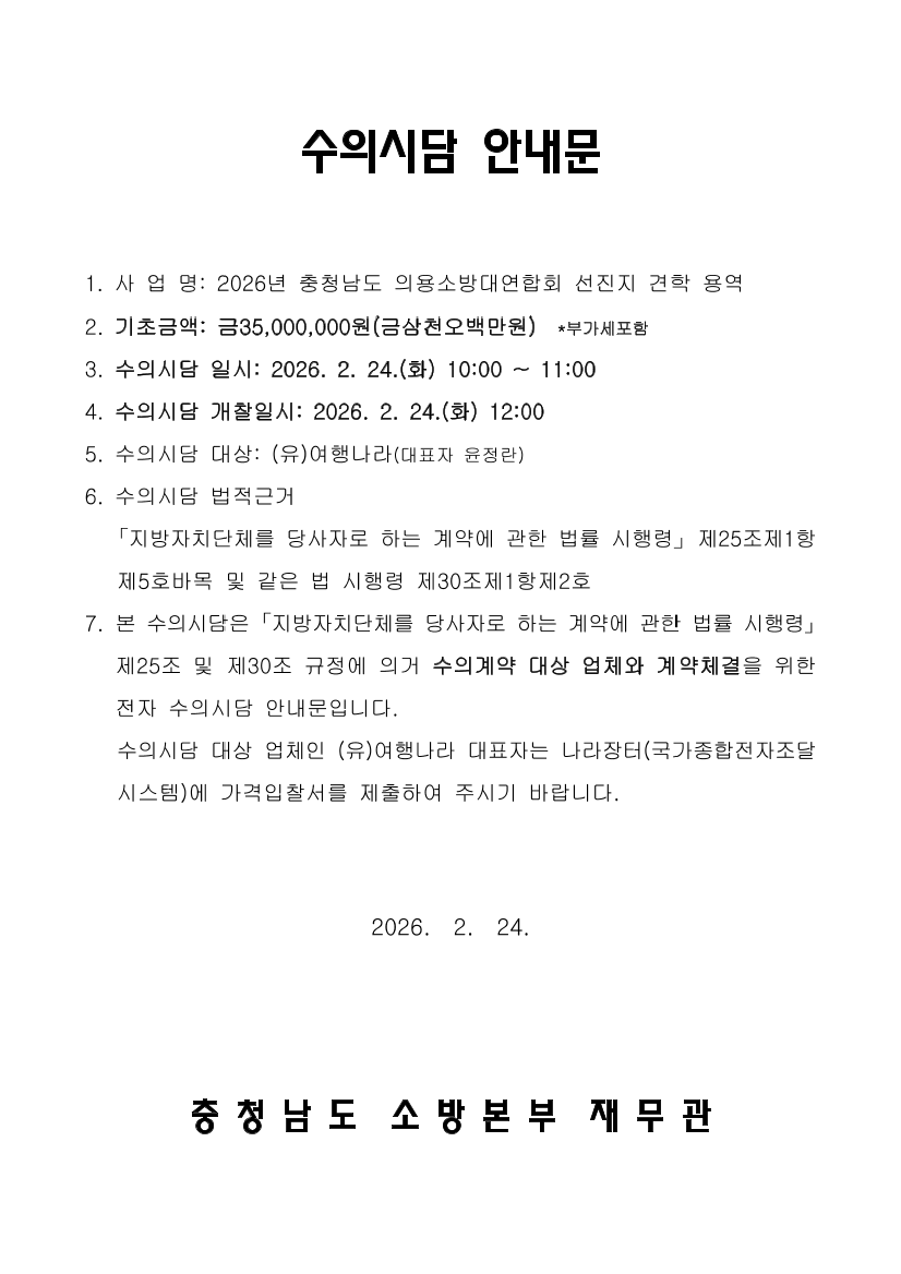 2026년 충청남도 의용소방대연합회 선진지 견학 위탁 용역 |