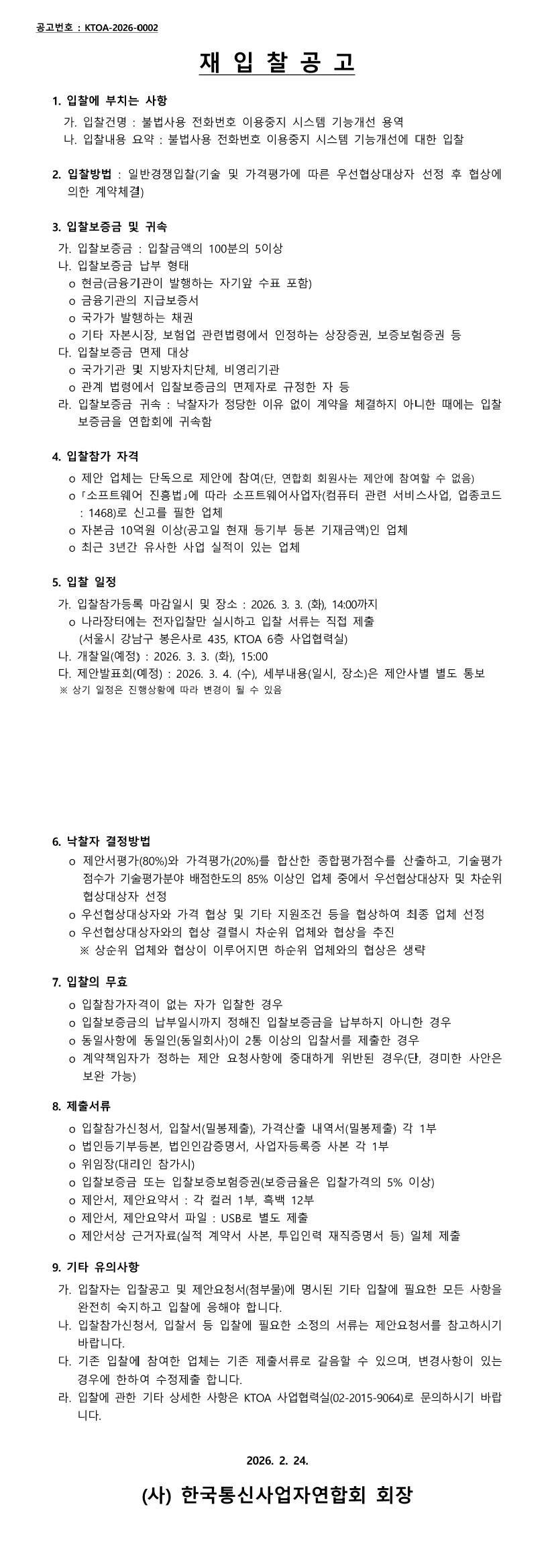 2026년도 불법사용 전화번호 이용중지시스템 기능개선 용역 업체 선정 |