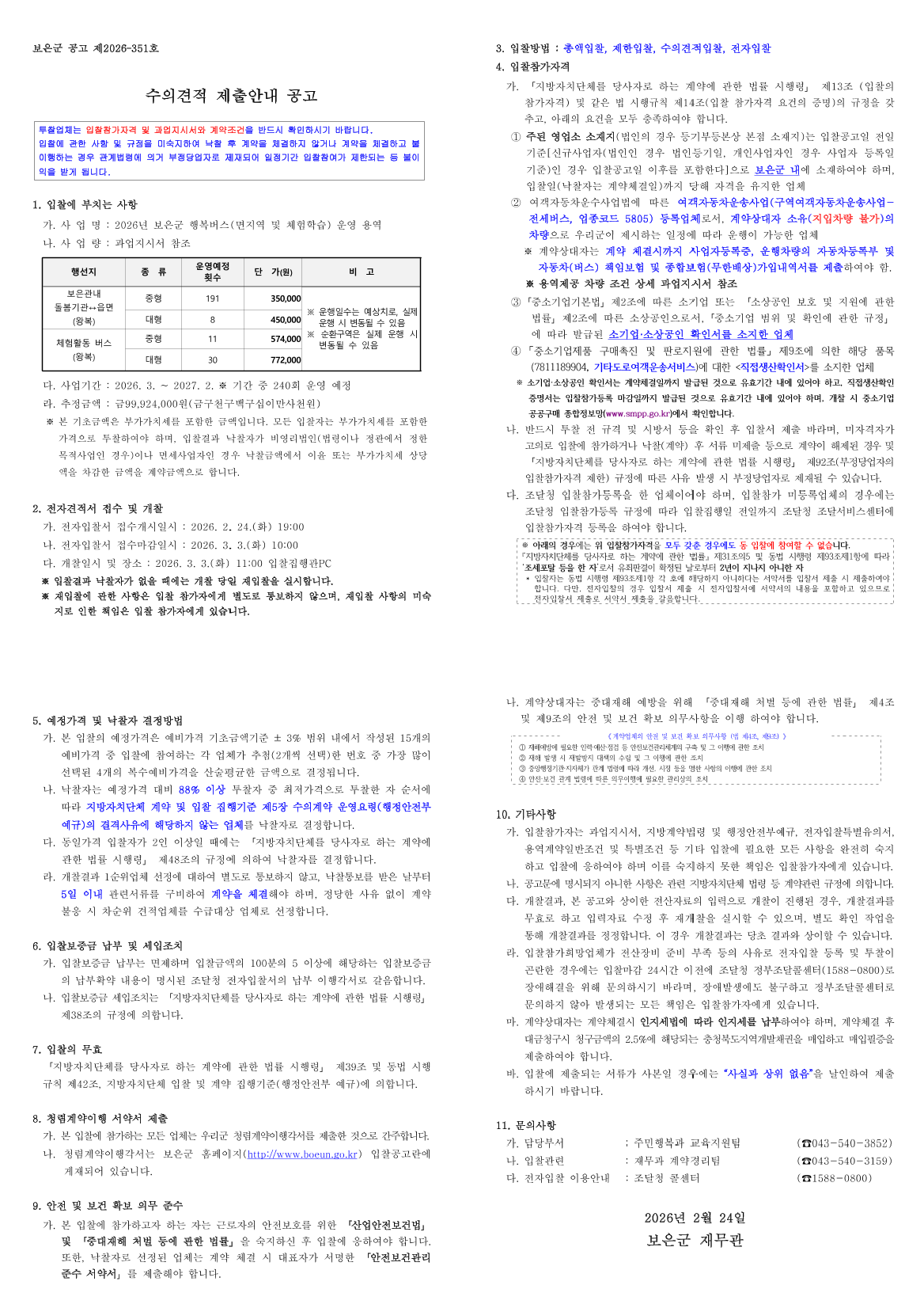 2026년 보은군 행복버스(면지역 및 체험학습) 운영 용역 |