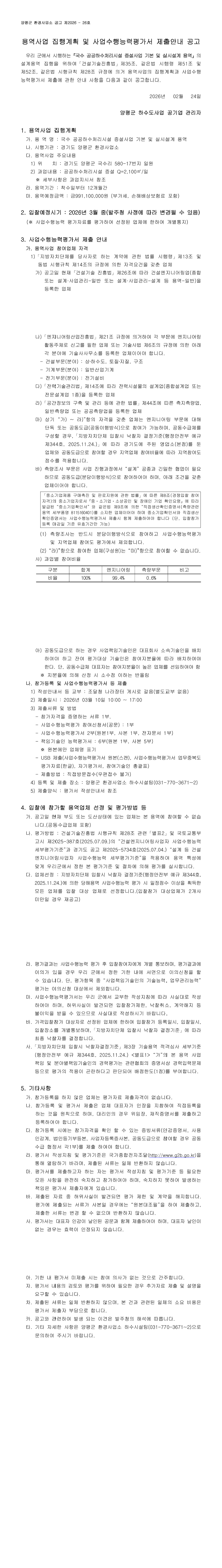 용역사업 집행계획 및 사업수행능력평가(P.Q.) 제출안내 공고(국수 공공하수처리시설 증설사업 기본 및 실시설계 용역) |