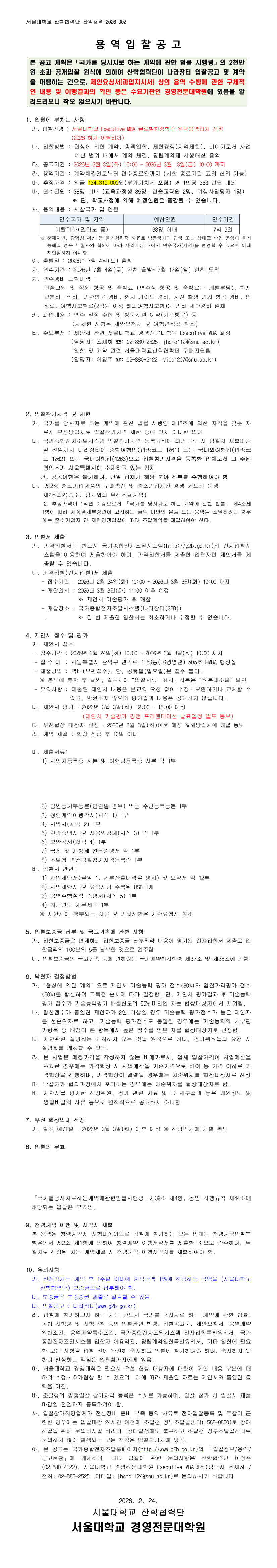 서울대학교 Executive MBA 글로벌현장학습 위탁용역업체 선정(2026년 하계-이탈리아)_PA202600185 |