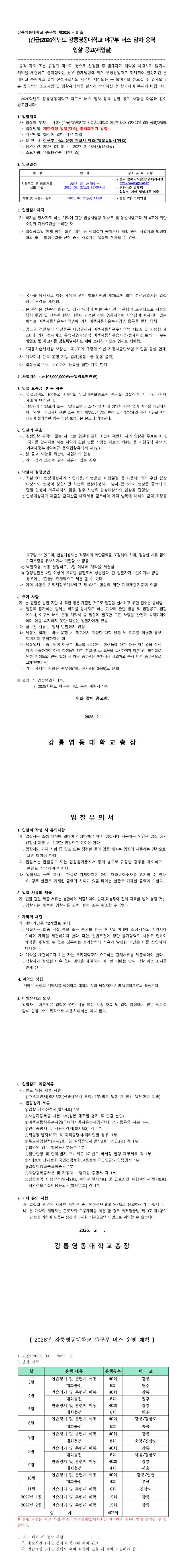 (긴급)2026학년도 강릉영동대학교 야구부 운행 버스 임차 용역 입찰 공고(재입찰) |