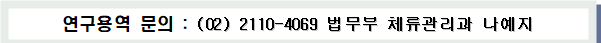 법무부에서는 다음과 같이 연구용역을 시행하고자 합니다. 용역계약을 원하는 기관(단체)은 아래 사항과 ‘국가 입찰 및 계약 집행기준’의 용역입찰 유의서, 국가종합전자조달시스템 전자입찰 특별유의서, 국가종합전자조달시스템 입찰참가자격 등록규정, 정부입찰·계약 집행기준, 용역계약 일반조건, 용역계약 특수조건, 협상에 의한 계약체결 기준, 기타 입찰‧계약 관련 법령 및 규정, 과업지시서 및 본 공고문을 숙지한 후 입찰(견적)에 참가하여 주시기 바랍니다.