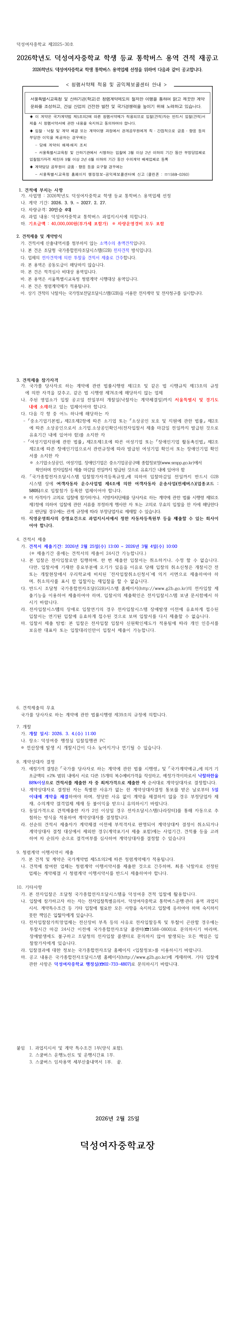 2026학년도 덕성여자중학교 학생 등교 통학버스 용역 견적 재공고 |