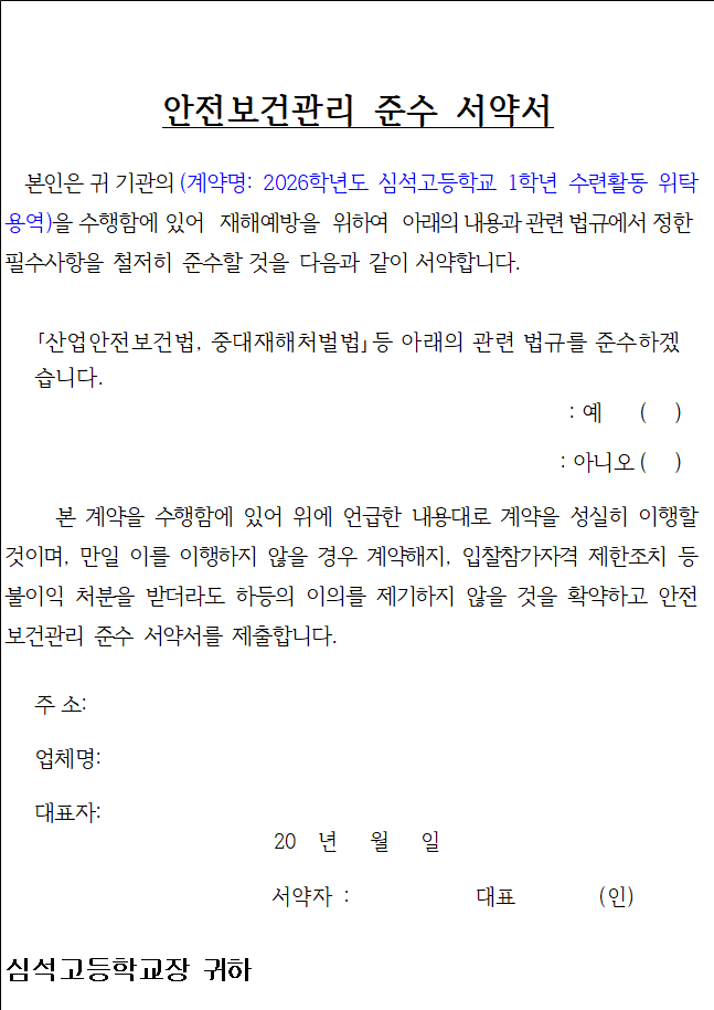 □ 정보이용 목적 : 2026학년도 심석고등학교 1학년 수련활동 용역