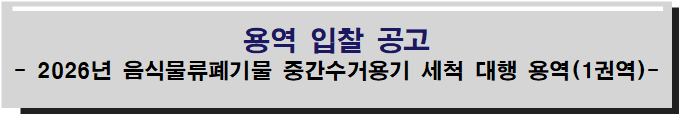 『2026년 음식물류폐기물 중간수거용기 세척 대행 용역(1권역_단년도차수계약)』계약을 위하여 「지방자치단체를 당사자로 하는 계약에 관한 법률」 제10조 및 같은 법 시행령 제33조, 지방자치단체 입찰 및 계약집행기준의 규정에 따라 아래와 같이 입찰 공고합니다.