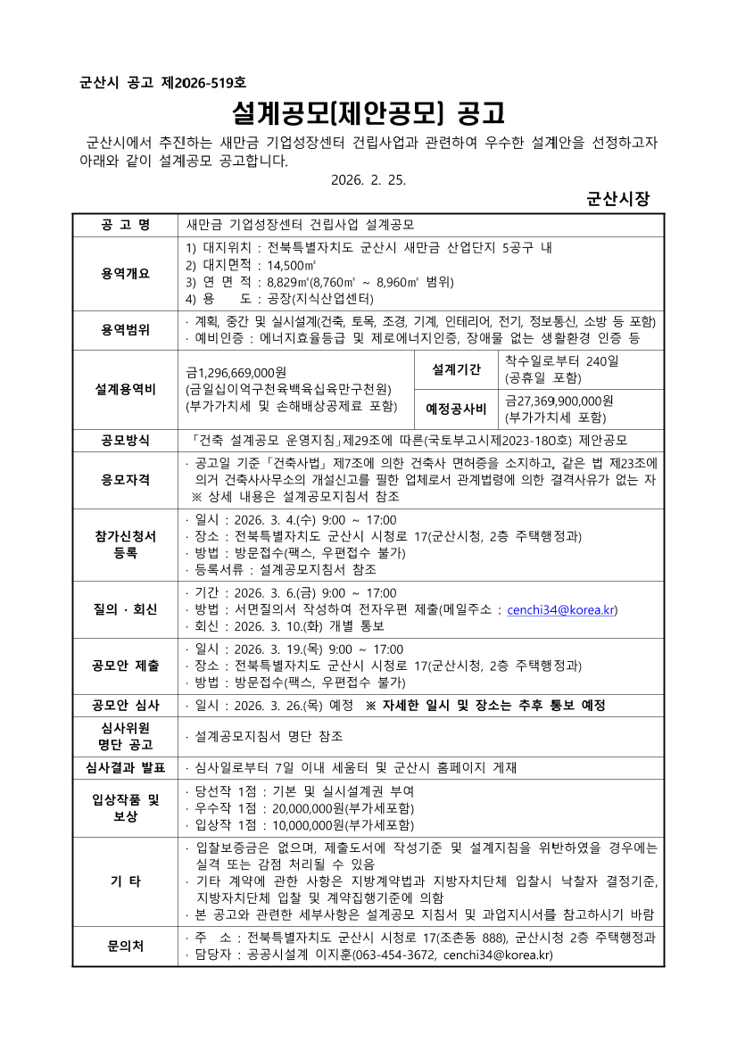새만금 기업성장센터 건립 기본 및 실시설계용역 설계공모 |