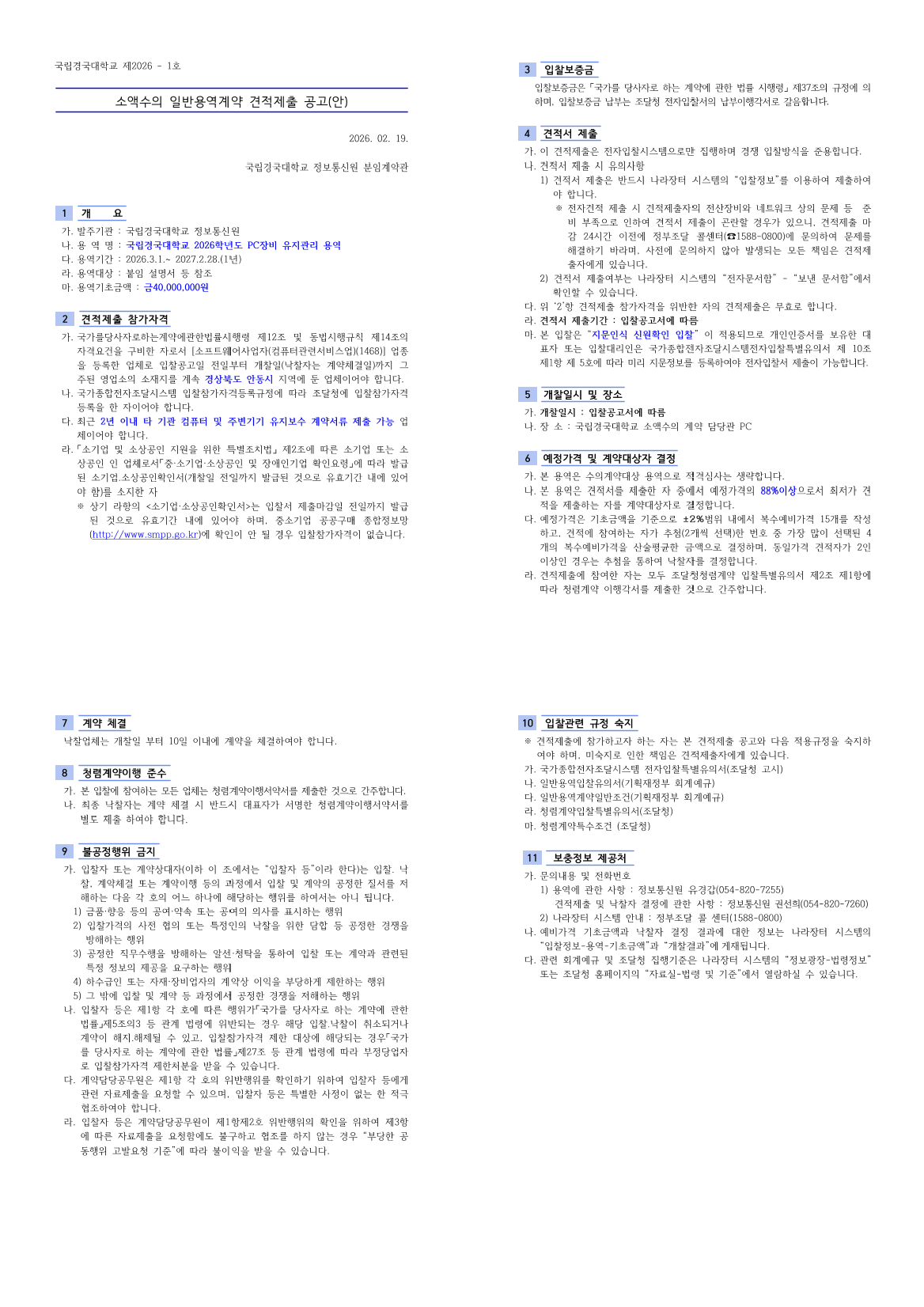 2026년도 국립경국대학교 PC장비 유지관리 용역 |