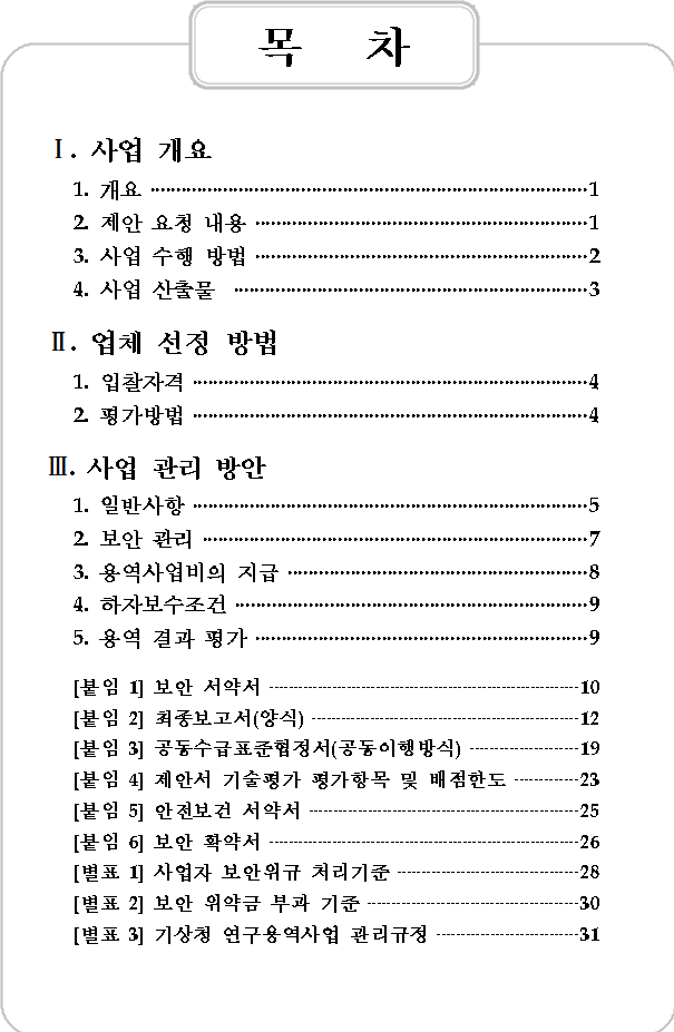 - 계약상대자는 계약 종료 15일 전까지 서면 형식의 결과보고서를 제출하여야 하며, 결과보고서에는“2. 제안 요청 내용”에 포함된 내용이 작성되어야 한다. 최종보고서 양식은「기상청 연구용역사업 관리규정」의 별지 제5호 서식을 따르며[붙임 2], 사업 종료일까지 국립기상과학원의 보완 요구사항이 반영된 최종보고서를 제출하여야 한다. 최종보고회는 국립기상과학원과 협의하여 개최하여야 한다.