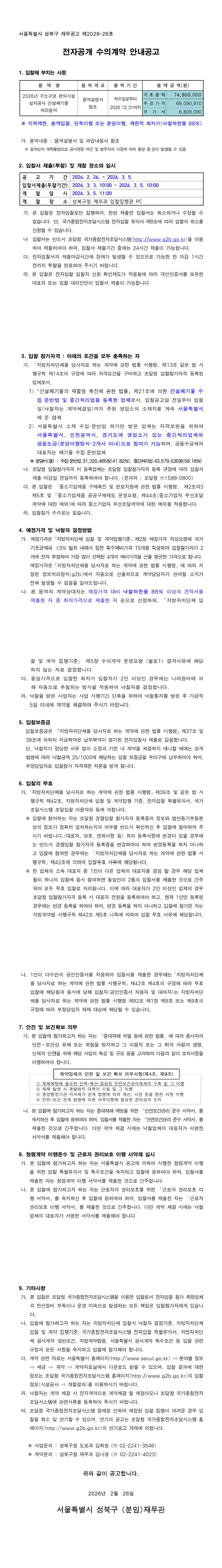 2026년 구소규모 편익시설 설치공사 건설폐기물 처리용역 |