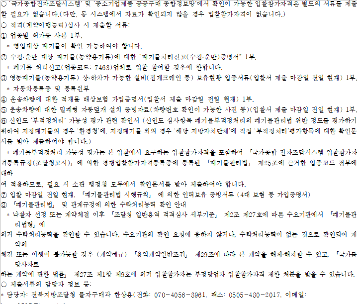 ※ 「조달청 일반용역 적격심사 세부기준」 제9조 제1항 제3호에 따라 폐기물처리용역에서 관련 법령이 정하는 업종 또는 면허