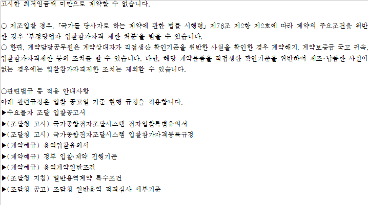 를 거쳐 낙찰자를 결정하므로 입찰자는 낙찰자결정기준속성(0001) : 「조달청 일반용역 적격심사세부기준」 관련 특수조건, 기타 입찰에 필요한 모든 사항을 자세히 알고 입찰에 참가하여야 합니다.