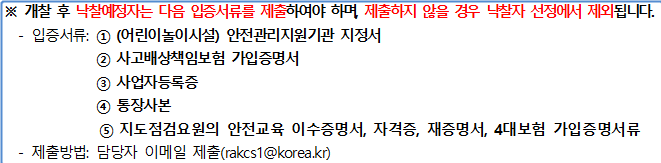 ※ 지도점검요원은 어린이놀이시설 안전관리법 제20조에 따른 안전교육을 이수하여야 하고, 안전관리에 대한 일정 수준의 능력을 갖추고 업무에 대한 충분한 정보와 지식을 숙지하고 있어야 함. (지도점검요원의 안전교육 이수증명서, 자격증, 재증명서, 4대보험 가입증명서류 등 계약 체결 전까지 제출)