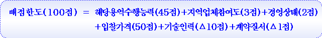 - 지역업체 참여비율 30%이상 3점, 30%미만 20%이상 1점, 20%미만 0점 처리함.