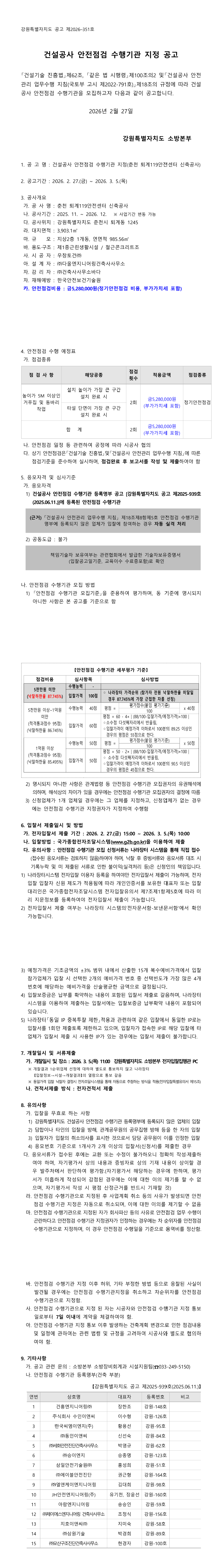 건설공사 안전점검 수행기관 지정(춘천 퇴계119안전센터 신축공사) |