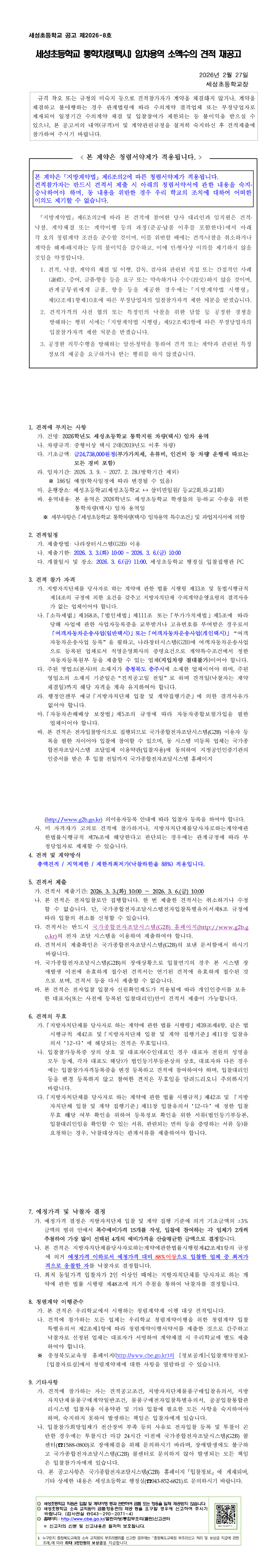 세성초등학교 통학차량(택시) 임차용역 소액수의 견적 재공고 |