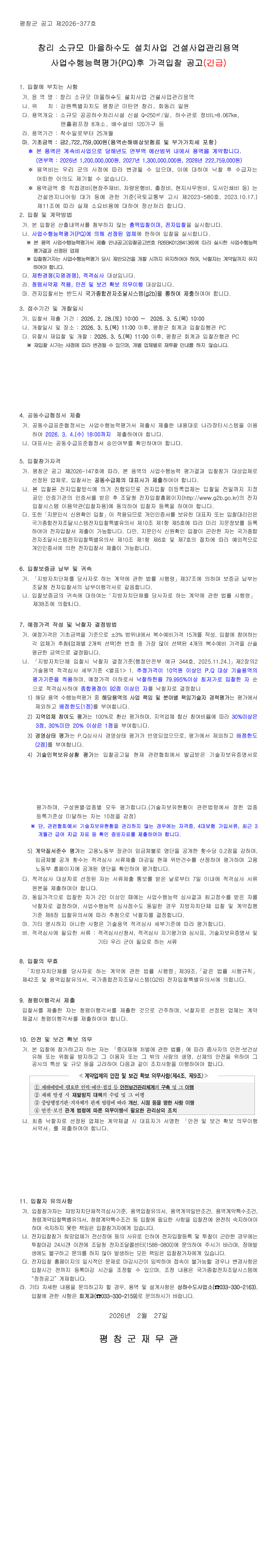 창리 소규모 마을하수도 설치사업 건설사업관리용역(PQ 후 가격입찰 공고) |