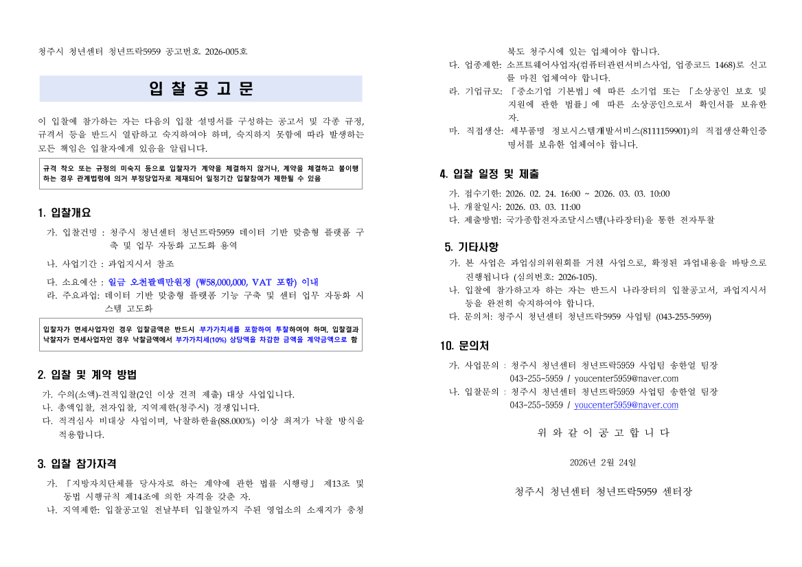 청주시 청년센터 청년뜨락5959 데이터 기반 맞춤형 플랫폼 구축 및 업무 자동화 고도화 용역 |