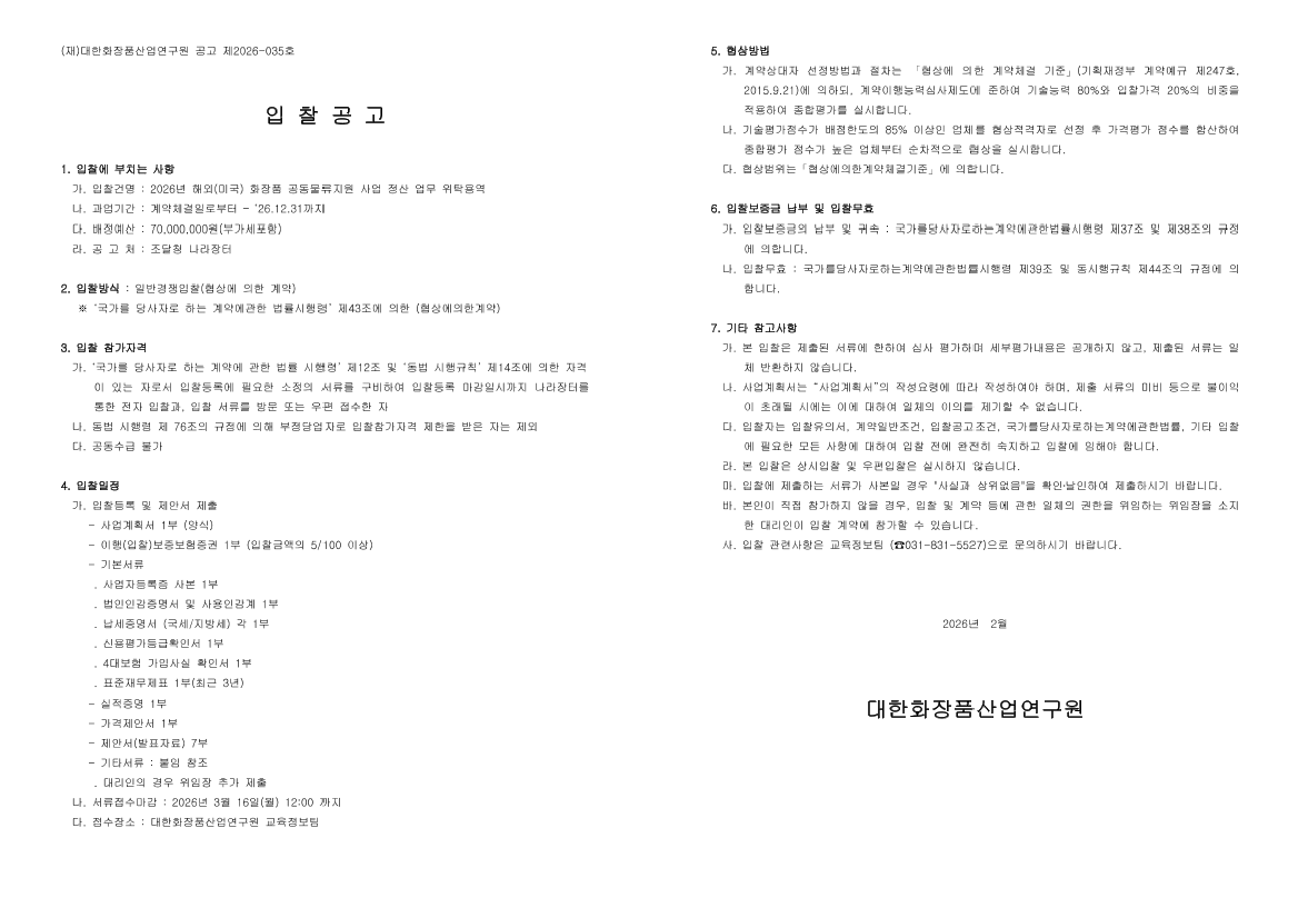 2026년 해외(미국) 화장품 공동물류지원 사업 정산업무 위탁용역 |