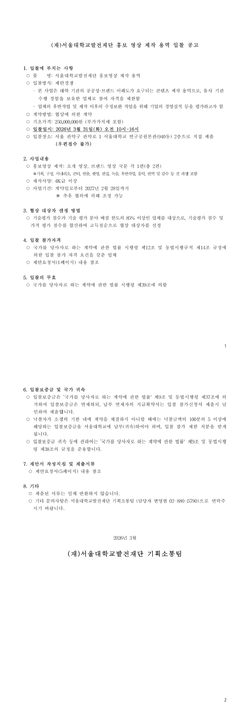 서울대학교발전재단 홍보 영상 제작 용역 |