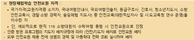 - 수련활동 지도자 명단 및 자격증 사본 1부(청소년지도사 및 안전요원 배치현황 포함)