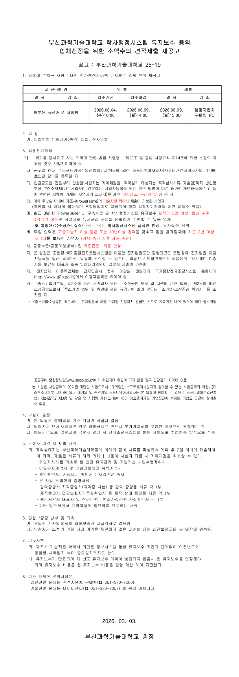 부산과학기술대학교 학사행정시스템 유지보수 용역업체 선정을 의한 소액수의 견적 제출 재공고 |