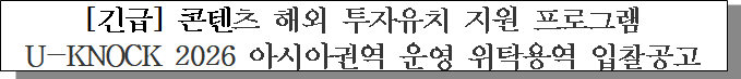ㅇ 입찰건명 : 콘텐츠 해외 투자유치 지원 프로그램 U-KNOCK 2026 아시아권역(일본, 싱가포르) 운영 위탁용역