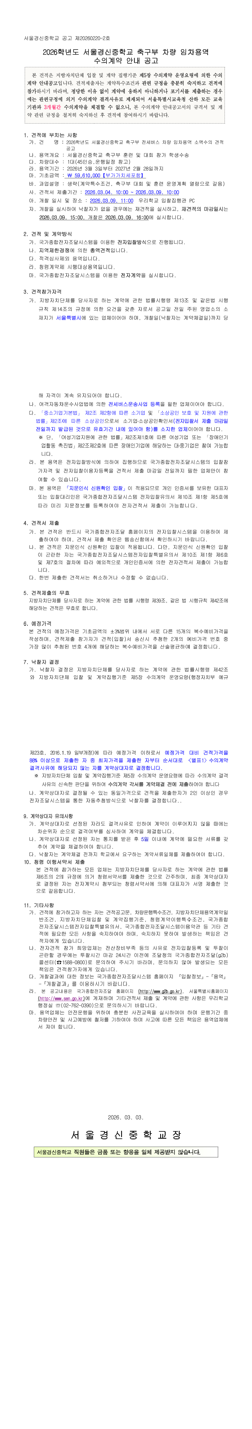 2026학년도 경신중학교 축구부 차량 임차 용역 |