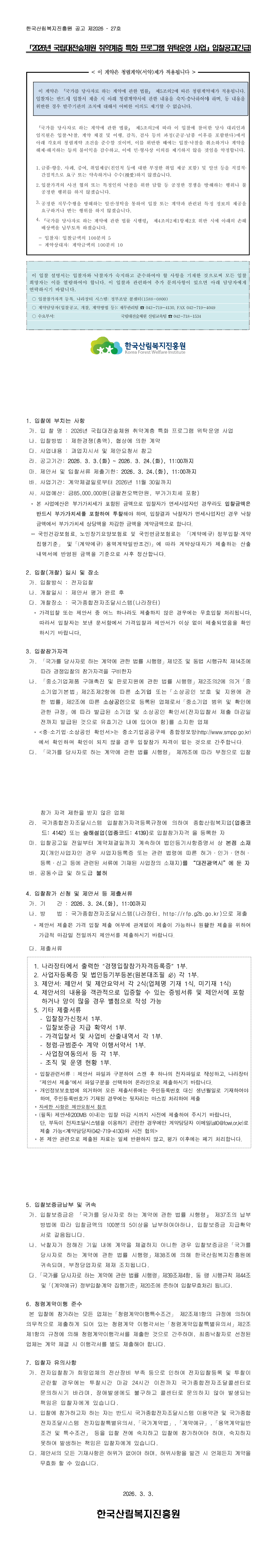 2026년 국립대전숲체원 취약계층 특화 프로그램 위탁운영 사업 |