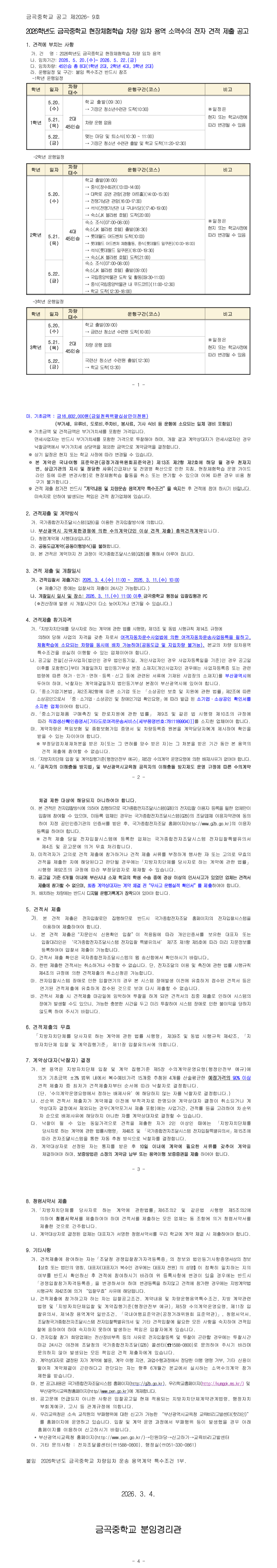 금곡중학교 2026학년도 현장체험학습(1,2,3학년)차량 임차 용역 소액수의 견적 공고 |