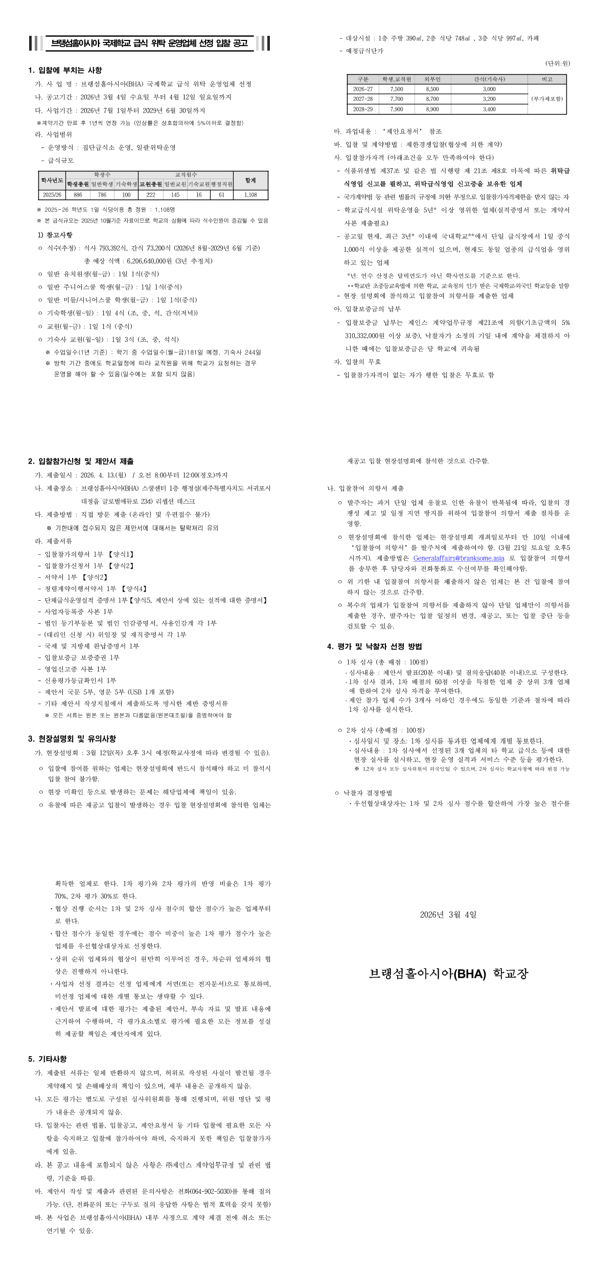 브랭섬홀아시아 국제학교 급식 위탁 운영업체 선정 |