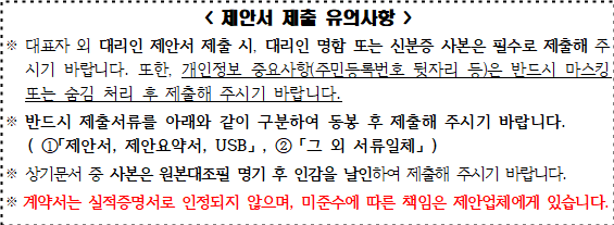 o ‘제안서’는 향후 계약서의 일부로 인정되오니, 작성에 유의하시기 바라며, 허위사실 기재 시 입찰무효에 해당되오니 유념하시기 바랍니다.