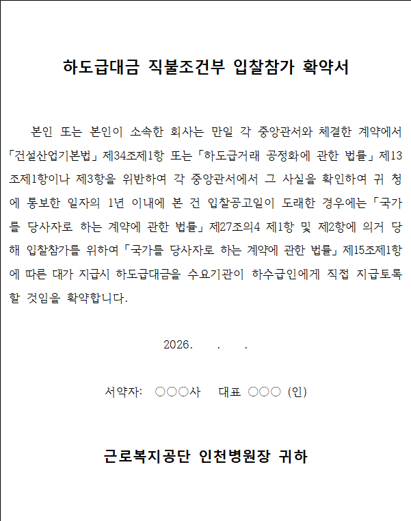 ③ ②에도 불구하고, 나라장터 시스템을 이용하여 제출하는 경우에는 전자입찰서에 ‘하도급대금 직불조건부 입찰참가 확약서’의 내용을 포함하고 있으므로 전자입찰서 제출로 확약서 제출을 갈음합니다.